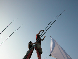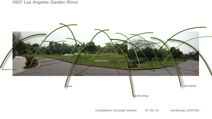 Jenna Didier and Oliver Hess of infranatural invited workshop:LEVITAS to design a bamboo bridge for the installation. The bridge began with a simple structural diagram drawn by Bruce Danziger, resembling a propped cantilever.