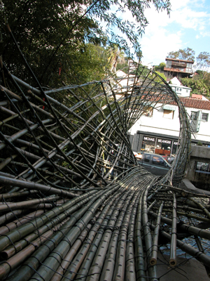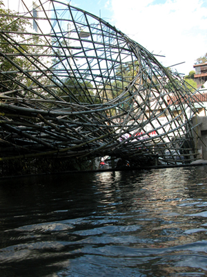 The bridge began with a simple structural diagram drawn by Bruce Danziger, resembling a propped cantilever. With the help of Moritz Freund and Schuchi Hsu, workshop:LEVITAS further developed the diagram to create a curved and partially cut-away tube to function as the primary stage from which visitors can interact with the water and its creatures. The bamboo tube is a walkthrough structure with transports, guides and protects the visitor during his experience with the Monsters.